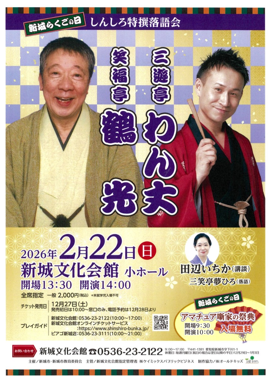しんしろ落語特撰会 2026年02月22日(日) 開演14:00 会場 新城文化会館 住所 愛知県新城市字下川1番地1 予約・問合せ 新城文化会館TEL:0536-23-2122 ※公演やチケットに関するお問い合わせは、各公演のお問い合わせ窓口までお願い致します