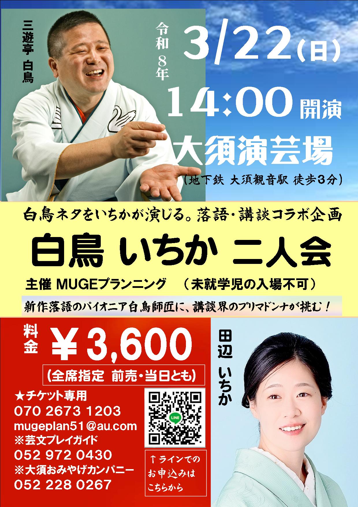 白鳥&いちか の会 2026年03月22日(日) 開演14:00 会場 大須演芸場 住所 愛知県 予約・問合せ 07026731203 mugeplan51@au.com ※公演やチケットに関するお問い合わせは、各公演のお問い合わせ窓口までお願い致します