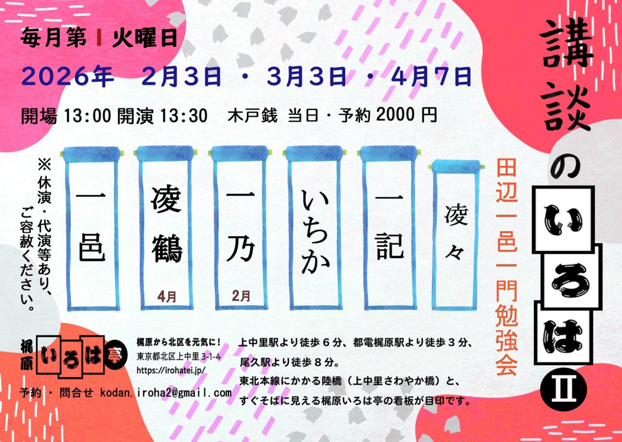 田辺一邑一門勉強会 2026年03月03日(火) 開場13:00開演13:30 会場 梶原いろは亭 住所 東京都北区上中里3丁目1-4 予約・問合せ kodan.iroha2@gmail.com ※公演やチケットに関するお問い合わせは、各公演のお問い合わせ窓口までお願い致します